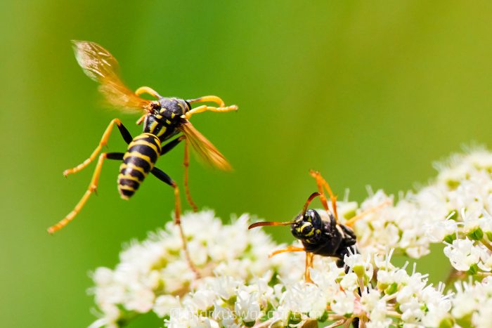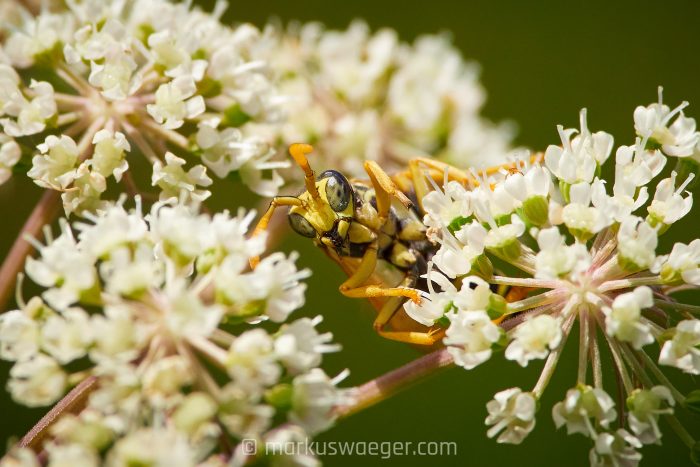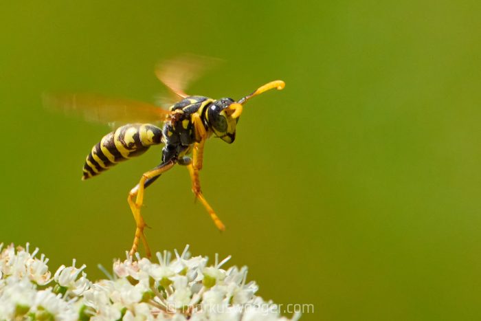 Aber um die Gemeine Wespe geht es hier gar nicht, sondern um die Feldwespe, streng genommen Gallische oder Französische Feldwespe. Sie hat kein Interesse an unserem Frühstück, sondern bevorzugen Pflanzennektar. Gerne nistet sie sich an Häusern ein, wo sie in wettergeschützten Bereichen ihre pappmachéartigen Bauten aufhängt. Fürchten muss man sich nicht, denn Feldwespen sind weder an uns interessiert noch aggressiv. Wer mehr über sie wissen möchte, für den verlinke hier hier einmal mehr zum Nabu.