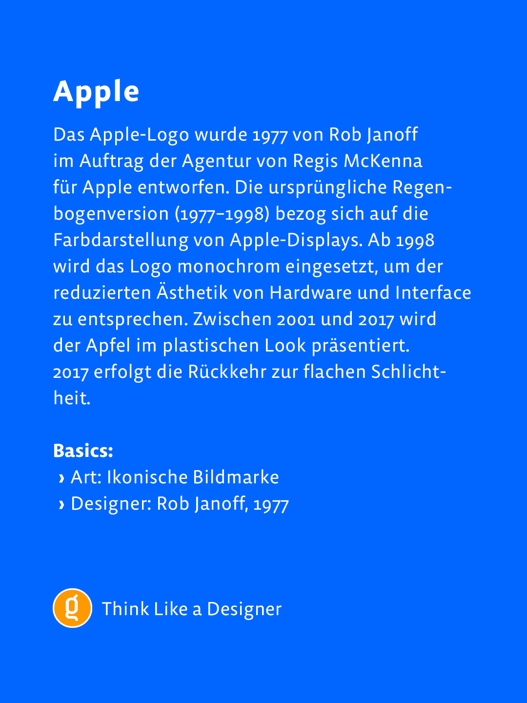 Das Apple-Logo wurde 1977 von Rob Janoff im Auftrag der Agentur von Regis McKenna für Apple entworfen. Die ursprüngliche Regenbogenversion (1977–1998) bezog sich auf die Farbdarstellung von Apple-Displays. Ab 1998 wird das Logo monochrom eingesetzt, um der reduzierten Ästhetik von Hardware und Interface zu entsprechen. Zwischen 2001 und 2017 wird der Apfel im plastischen Look präsentiert. 2017 erfolgt die Rückkehr zur flachen Schlichtheit.