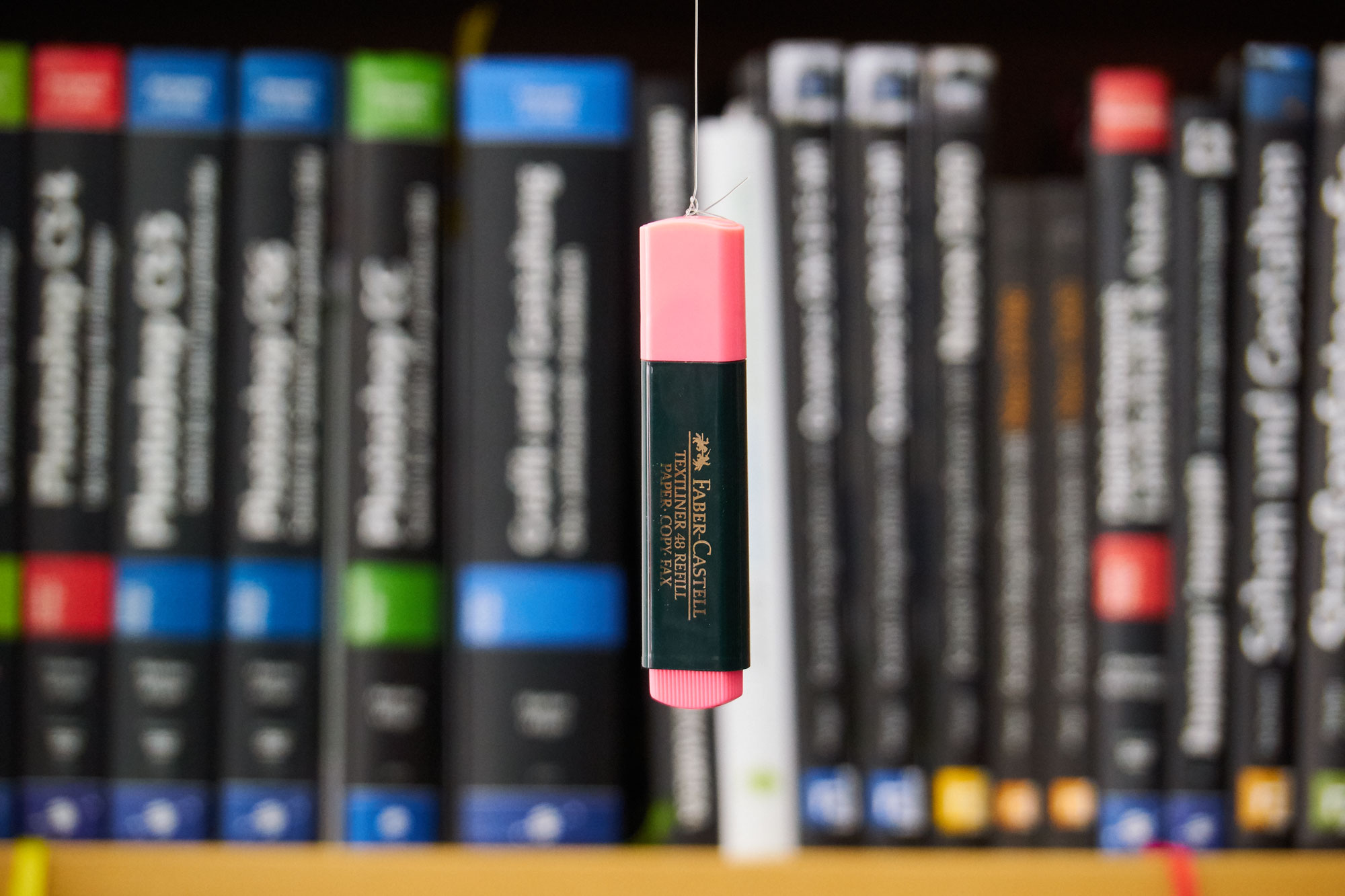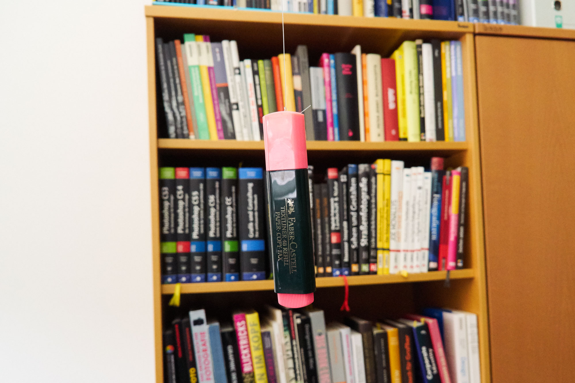 Im ersten Aufbau habe ich einen Textmarker etwa einen halben Meter vor meinem Bücherregal aufgehängt, und dann einmal bei 14mm aus geringer und einmal bei 150mm aus größerer Distanz abgelichtet.