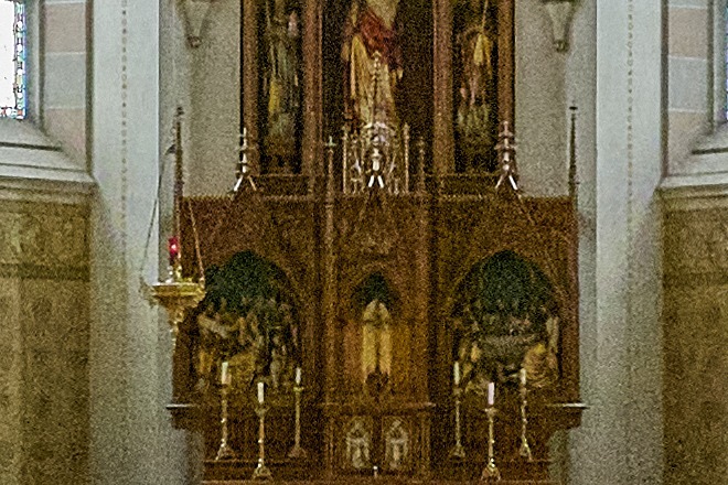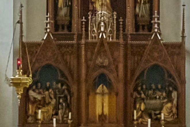 Interessant ist aber auch der umgekehrte Weg: Wie sieht es aus, wenn die 20MP der E-M1X einfach hoch interpoliert wird. Die Abbildung unten zeigt einen Ausschnitt, aus einer Aufnahme, die ich auf die Auflösung der Canon hochgerechnet habe. Man sieht dem Ausschnitt die Interpolation zwar an, doch wesentlich schlechter als Aufnahmen mit Handheld-High-Res-Modus ist das auch nicht. Wo das Bild hier überschärft wirkt, sieht das andere schwammig und unscharf aus.